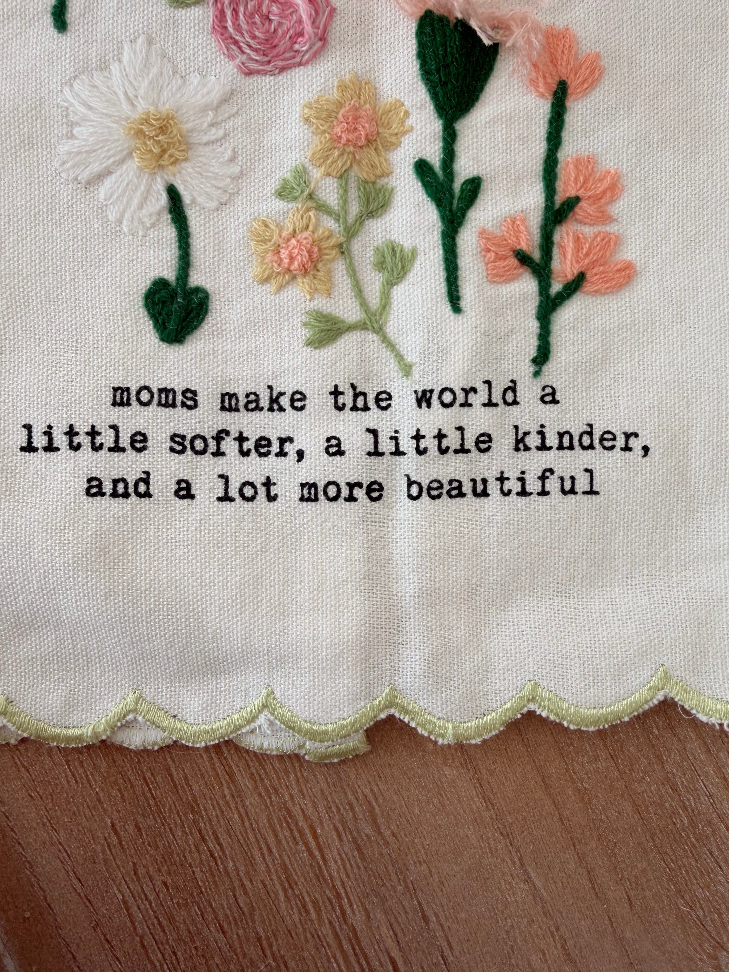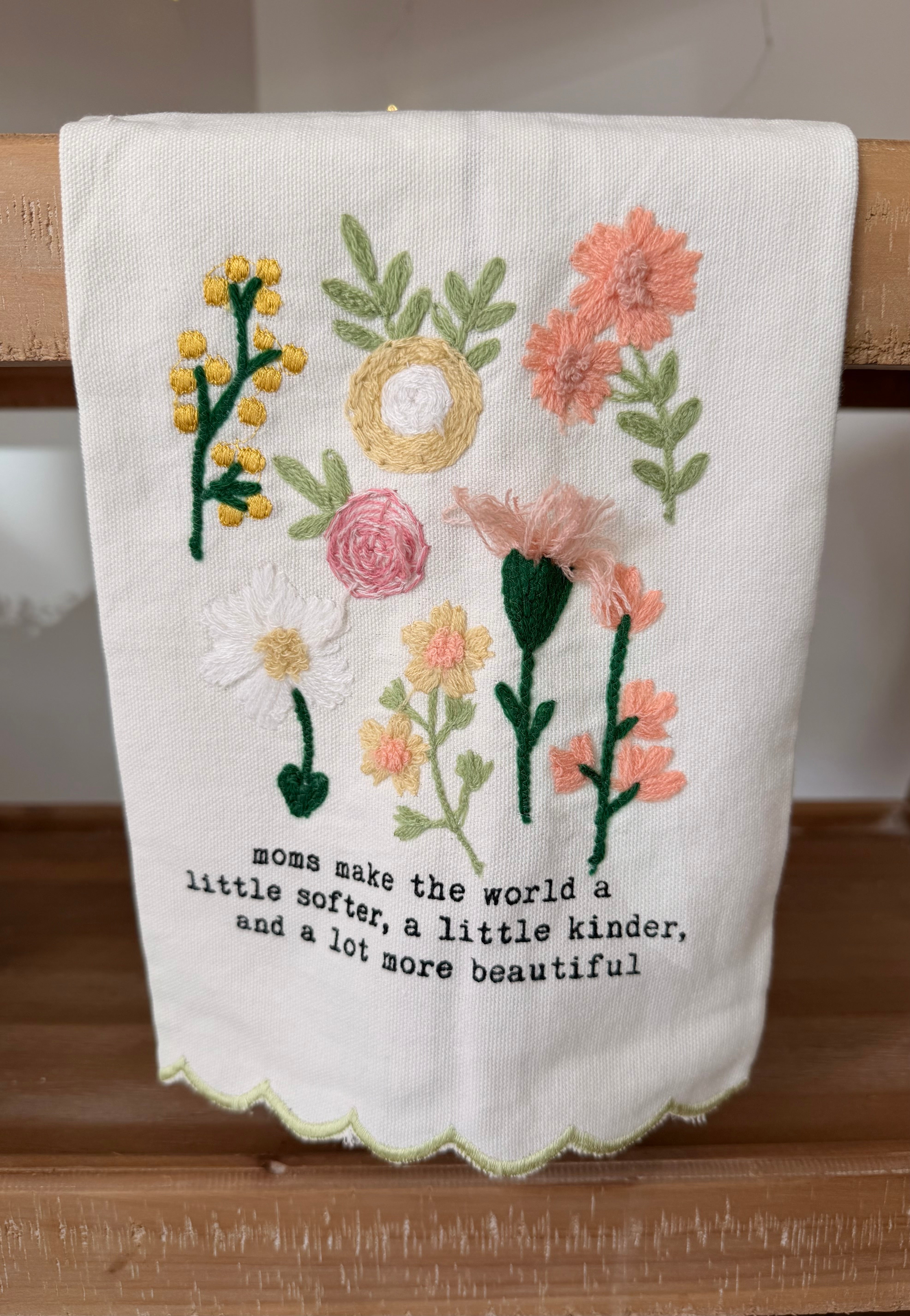 Crafted in a crisp white fabric, this towel features delicate embroidered florals in soft shades of white, yellow, pink, and green, bringing a fresh, cheerful feel to any kitchen. The thoughtful message reads: “Moms are the people who know us the best and love us the most”—a meaningful reminder she’ll see and appreciate every day.