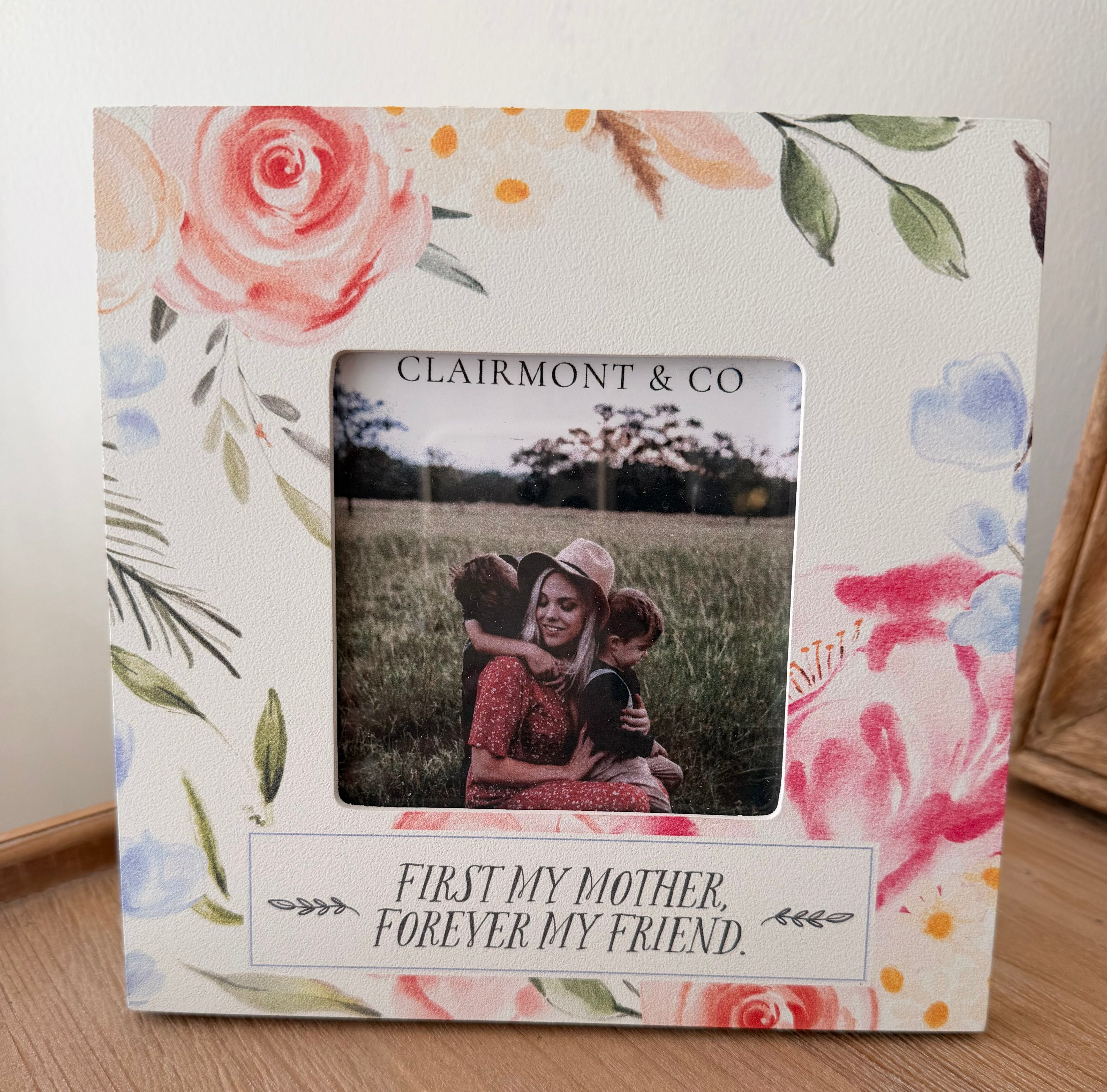 Sized at 7.5" x 7.5", it perfectly showcases a 4" x 4" photo—ideal for capturing a special moment between mother and child. The meaningful sentiment, “First My Mother. Forever My Friend.”, adds a touching reminder of the bond you share.