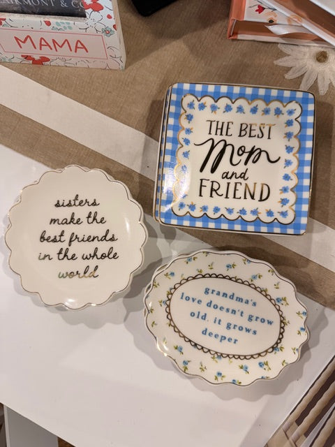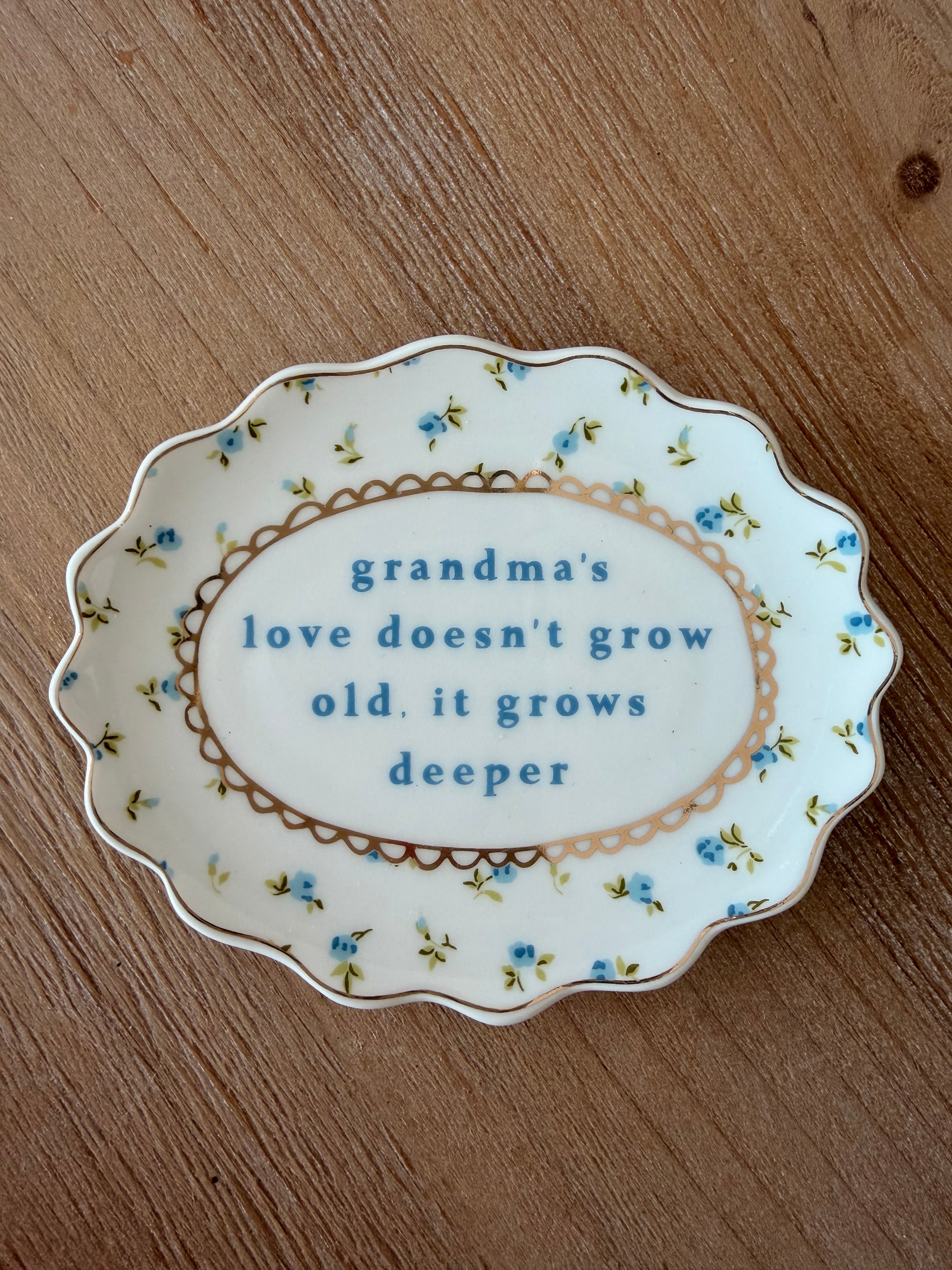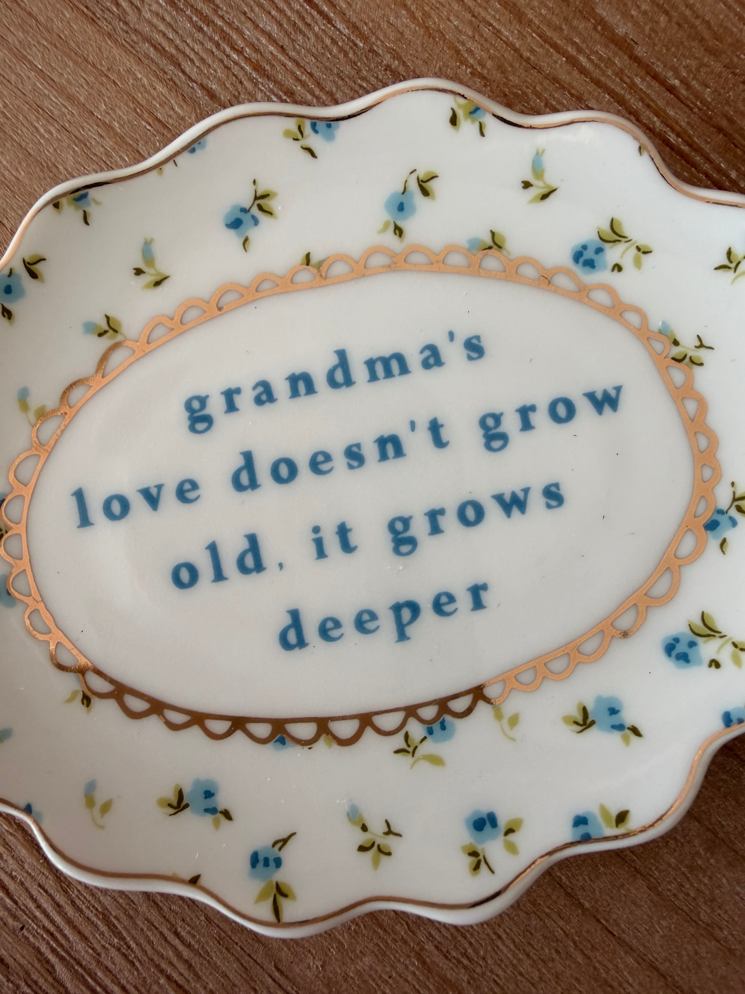 Designed in a soft white finish, this charming tray features delicate blue and green florals along the scalloped edge, accented with subtle gold foil detailing. At the center, the meaningful sentiment reads: “Grandma’s love doesn’t grow old. It grows deeper.”—beautifully displayed in soft blue lettering and framed with touches of gold for an elegant finish.